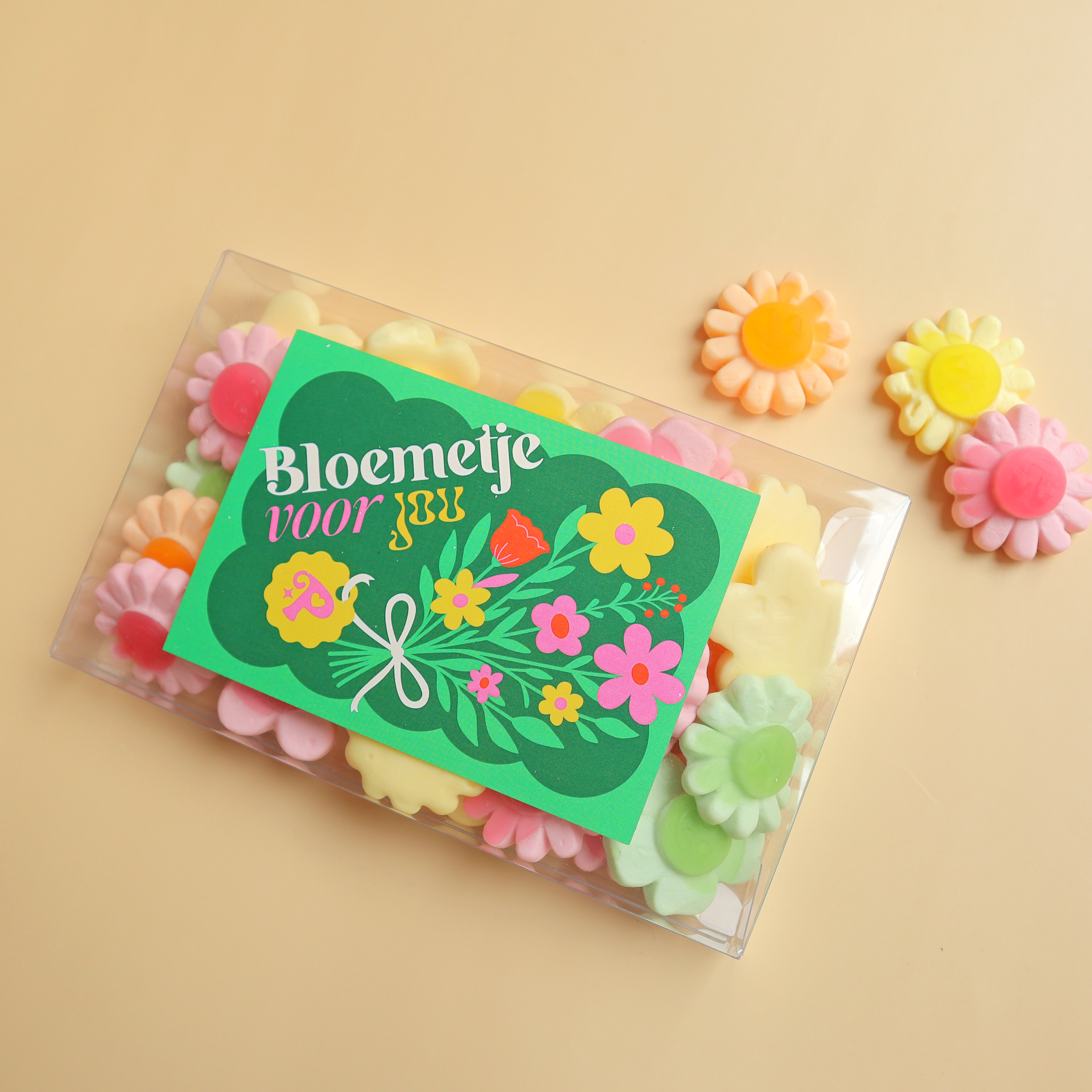 Zeg het met snoep! Het snoepcadeau 'Bloemetje voor jou' is een heerlijk alternatief voor een bos bloemen. Dit schattige doosje bevat zachte bloemensnoepjes in zachte kleuren.